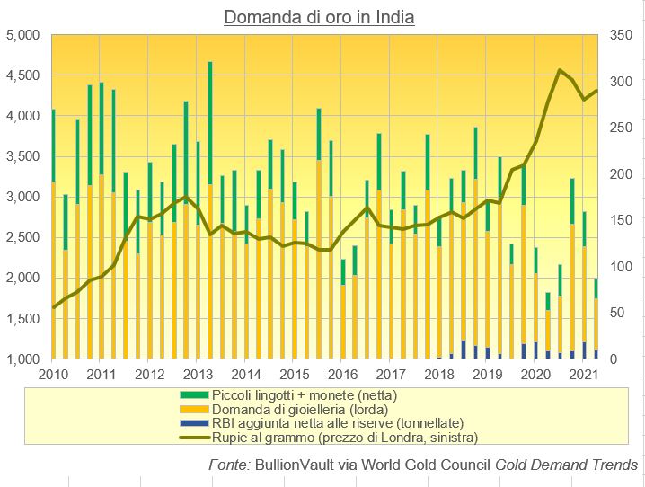 Per quanto riguarda gli acquisti di gioielleria, “dato che l’economia indiana è stata profondamente colpita dalla seconda ondata di Coronavirus” dicono gli specialisti di Metals Focus “una ripresa potrebbe aumentare la domanda di oro durante l’importante stagione di matrimoni e festiva” che inizierà a ottobre e si concluderà nel nuovo anno 2022.