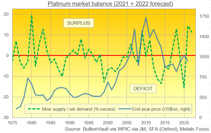 Anno dopo anno, nel mercato del platino, l'offerta mineraria è cresciuta rispetto alla domanda netta per l'uso finale 22 volte dal 1976, con un calo dei prezzi del platino nel 55% di quegli anni. Nei 23 anni in cui i deficit sono cresciuti o le eccedenze si sono ridotte, il prezzo del platino è aumentato il 70% delle volte.